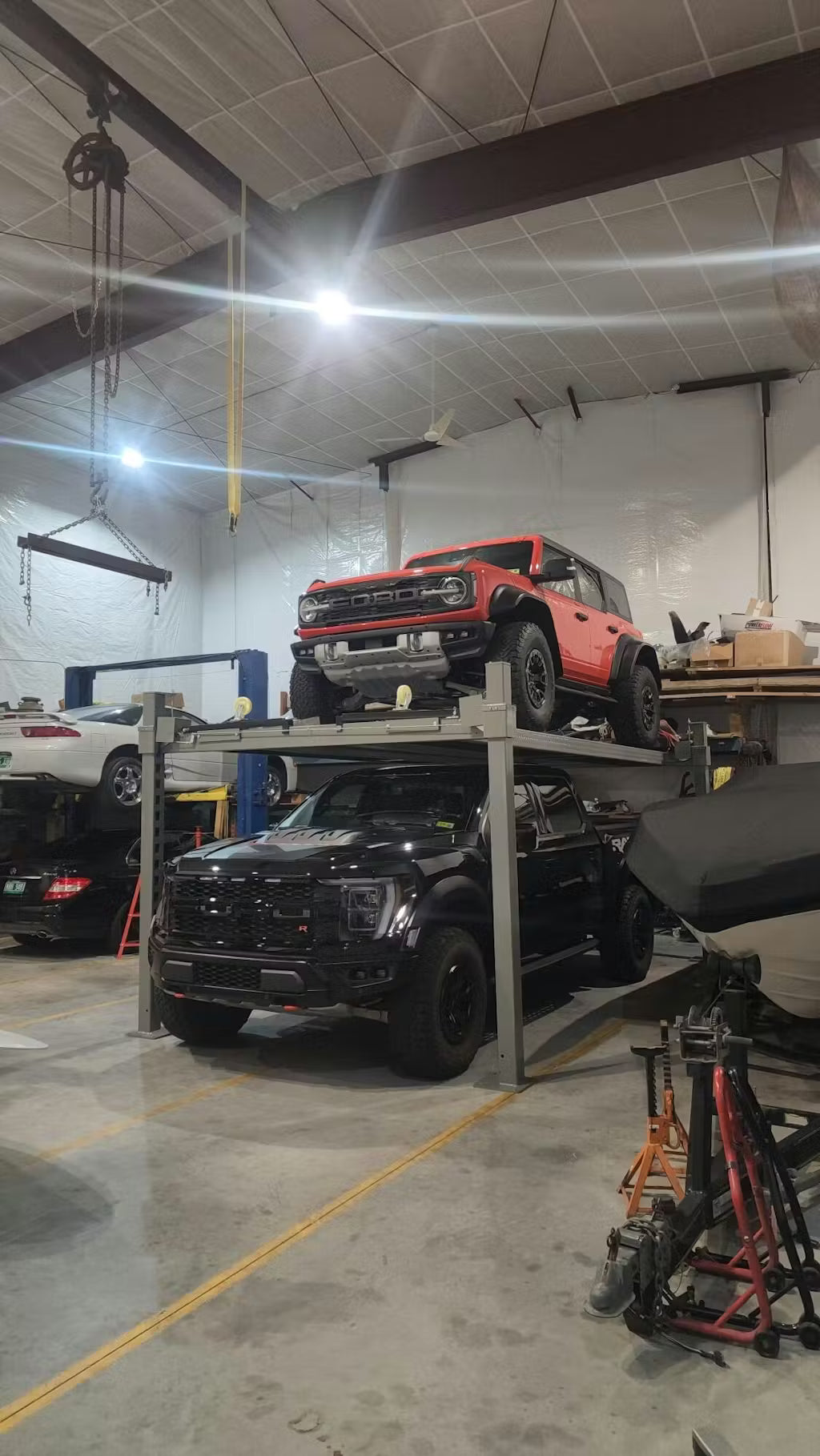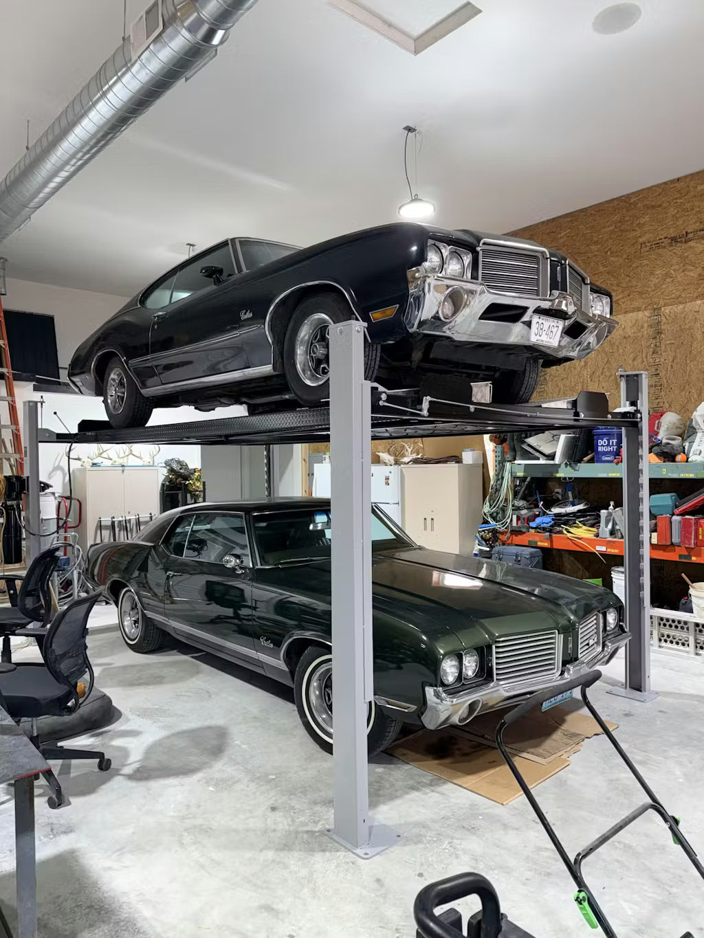 Easy operations. As you can see we stacked a Genesis GV80 coupe and John Wicks Mach 1 from the movie. You can find cheaper lifts but I wanted to make sure the cars are safe. Between the 2 cars mentioned we have 240 miles. Folks