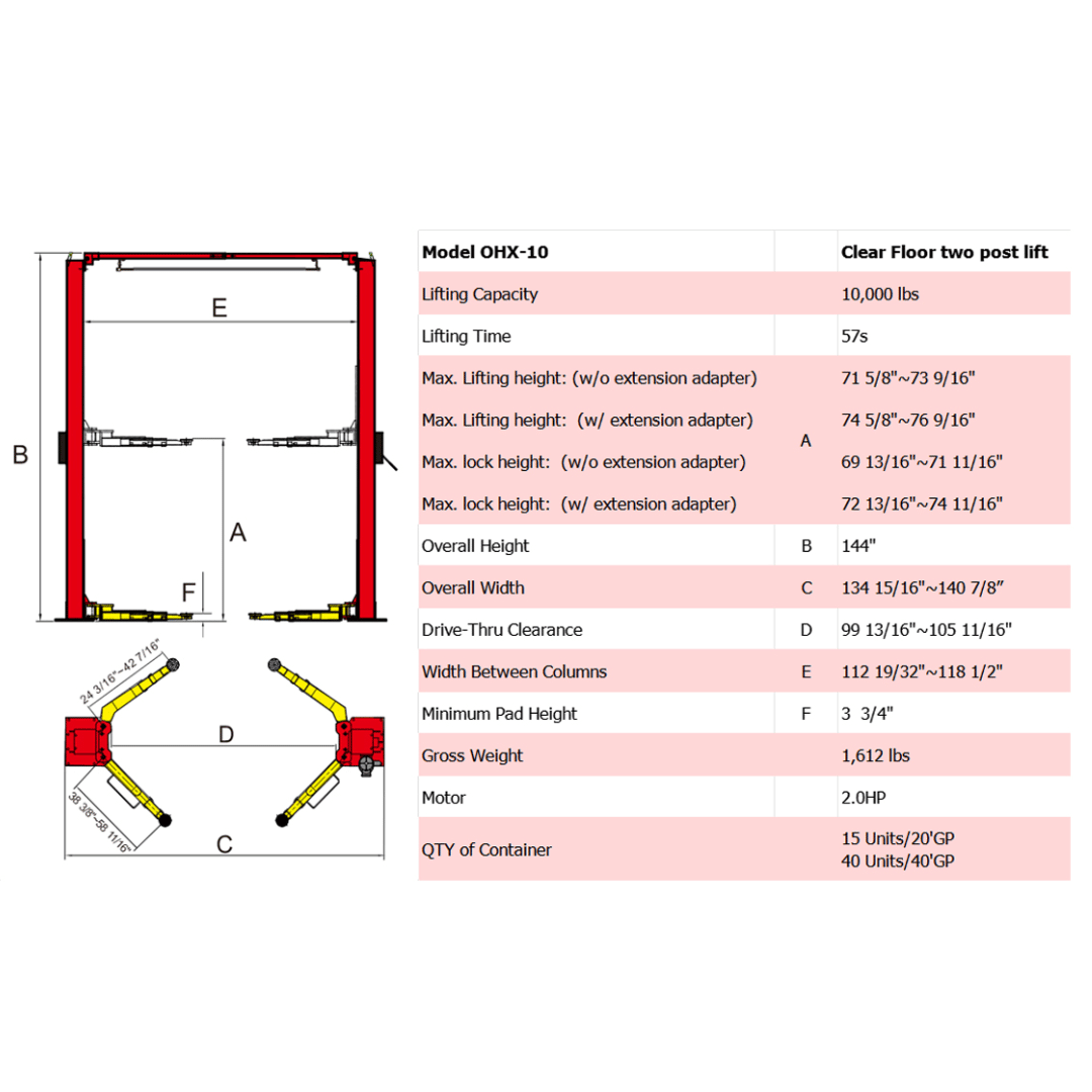 With adjustable width options and a drive-thru clearance up to 106 3/32 inches, the OHX-10 accommodates a wide variety of vehicles, from standard sedans to large SUVs and trucks. Its lifting height of up to 80 15/32 inches (with adapters) makes it perfect for full undercar work, tire service, and drivetrain access.
