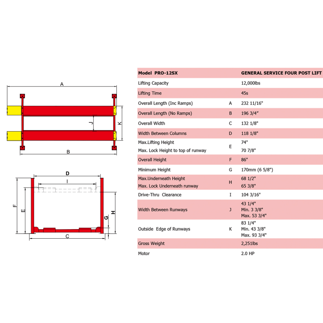 The PRO-12SX is engineered for safety and efficiency with a hydraulic cylinder that uses high-grade seals, a cable-slack protection system, and low platform height for easy vehicle access. Whether you're performing general service, inspections, or fleet maintenance, the PRO-12SX offers the strength, clearance, and reliability you need.