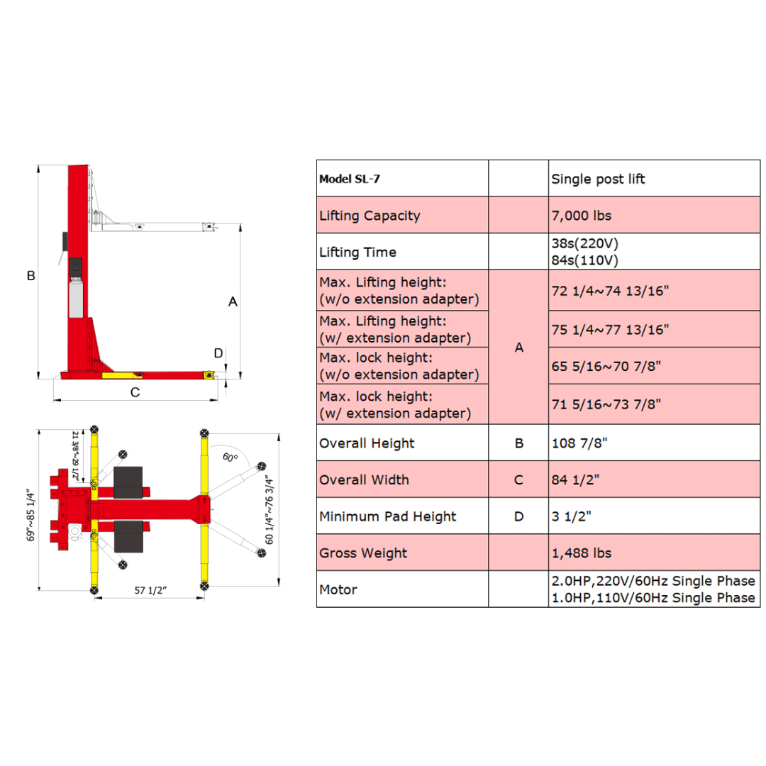 The SL-7 is one of the most space-saving lifts in its class, with an 84 1/2″ overall width and a maximum lifting height of up to 77 13/16" (with extension adapters). Despite its compact footprint, it’s built for durability with self-lubricating UHMW polyethylene sliders, bronze bushings, and high-grade hydraulic components, ensuring smooth and low-maintenance operation.