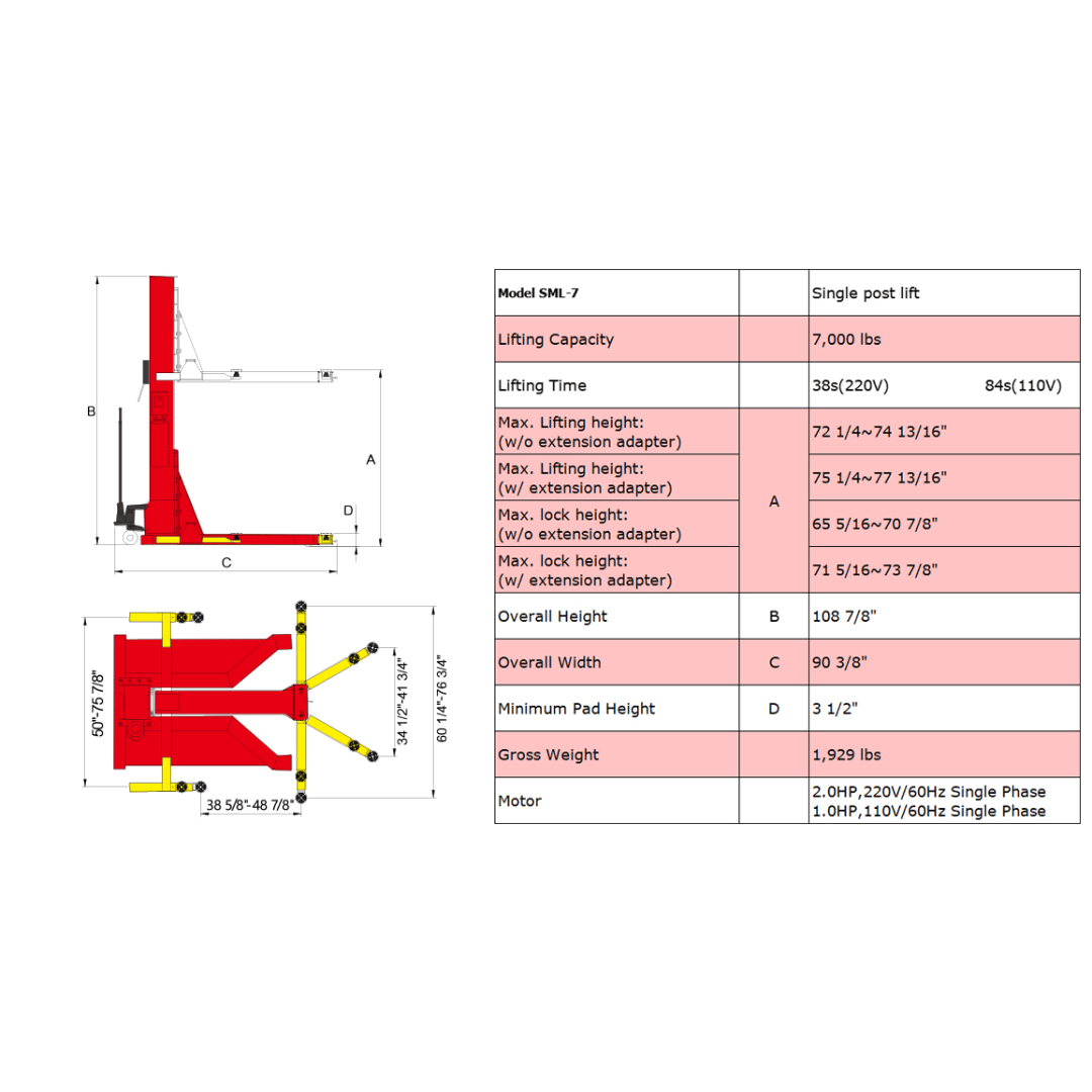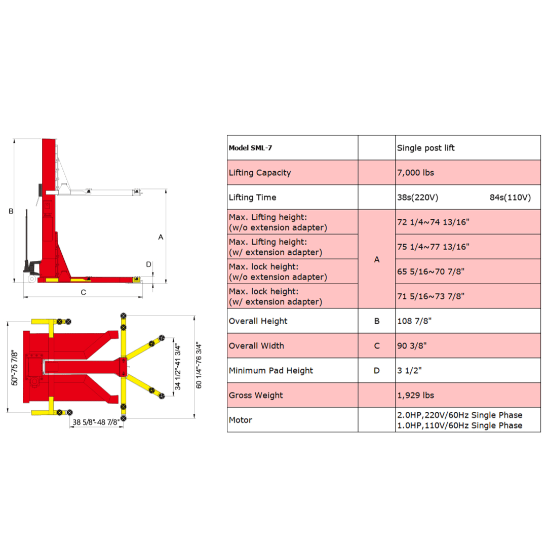 With adjustable two-stage arms, combined rubber pad assemblies, and 3” extension adapters included as standard, the SML-7 easily adapts to a wide range of vehicles — from low-slung coupes to small trucks. Built with self-lubricating UHMW polyethylene sliders and bronze bushings, this lift is engineered for durability, minimal maintenance, and daily use.
