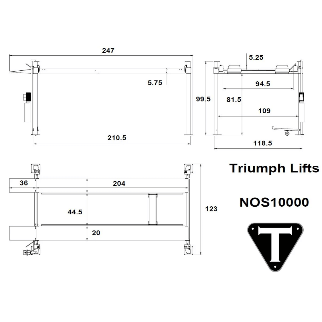 Free shipping to the lower 48 United StatesThe Triumph NOS10000 is a heavy-duty four-post automotive lift built for serious storage and service capacity. With a robust 10,000 lb lifting capability and a time-tested Outside Slider design, this lift delivers both strength and stability for your garage or commercial shop.