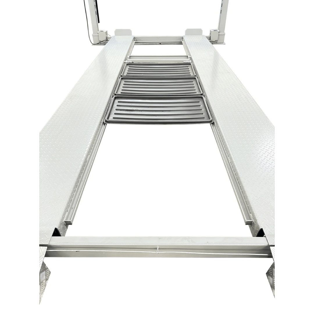 The lift is equipped with a manual deadbolt locking system featuring an oversized release linkage for secure and straightforward operation. A secondary redundant safety system adds peace of mind during every lift. The package includes lightweight 36" aluminum ramps (just 29 lbs each), heavy-duty poly-coated casters for portability, a rolling jack tray with drain plug, and a full set of drip trays to protect the vehicle below from any leaking fluids.
